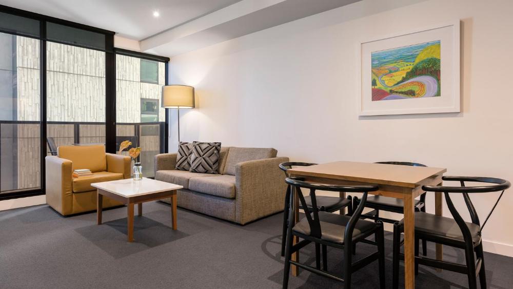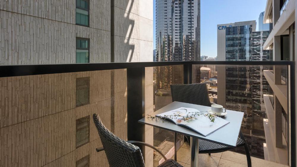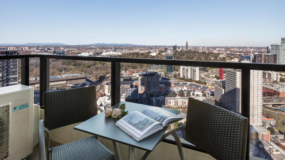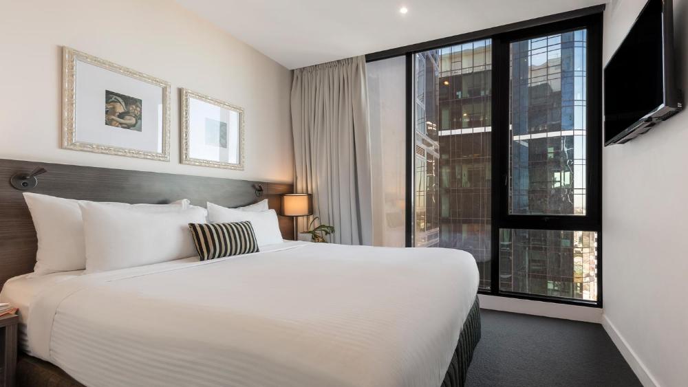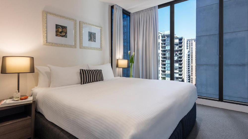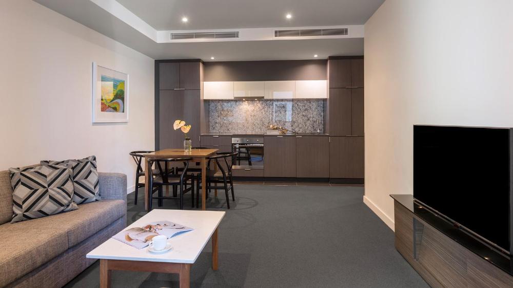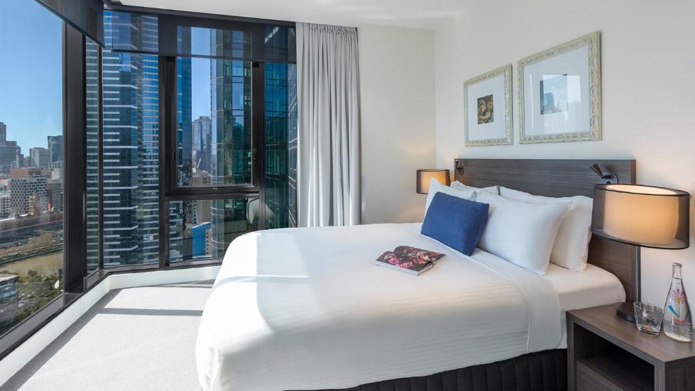 Images highlight bright apartments with open-plan living areas, full kitchens, and spacious bedrooms. Dining tables and lounge areas are styled with clean lines and modern touches. The gallery also captures the heated indoor pool, fitness centre, and on-site restaurant, alongside exterior views showcasing Southbank’s lively riverfront.