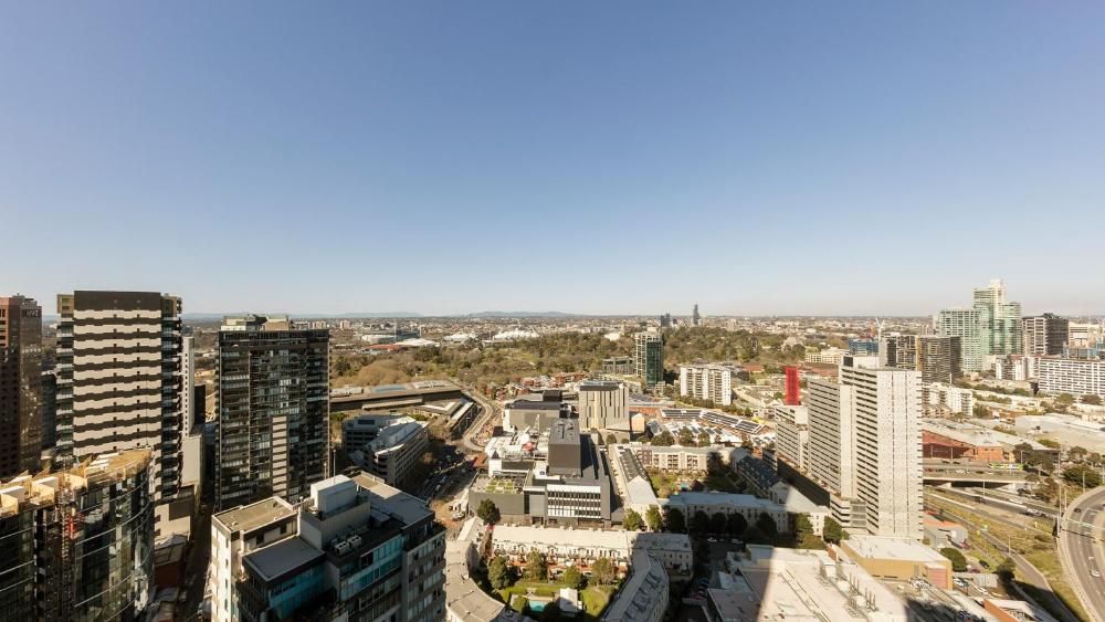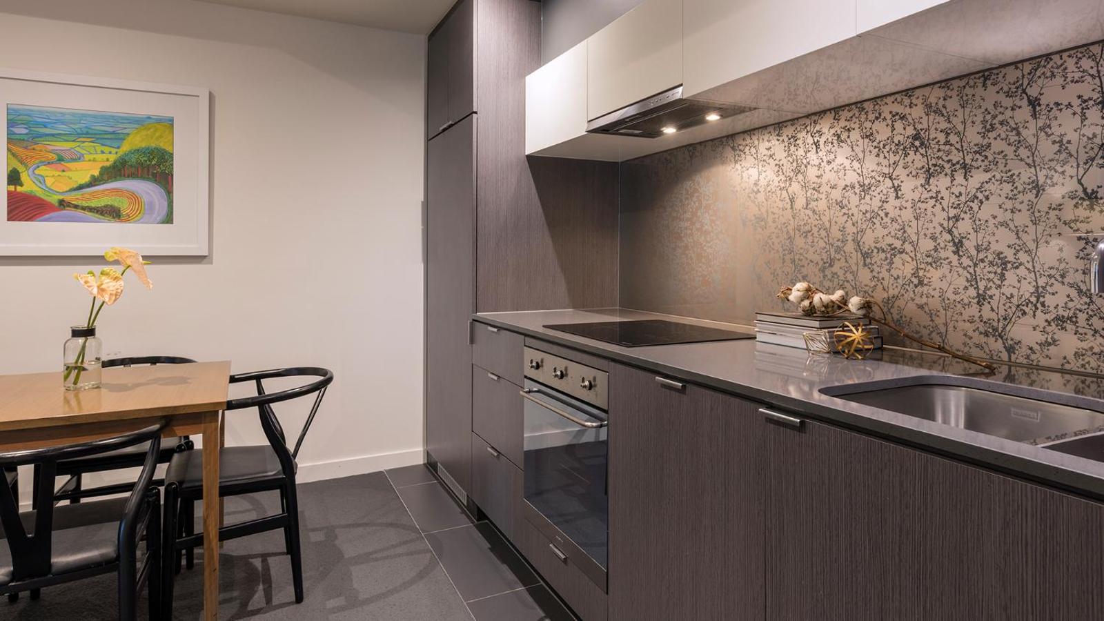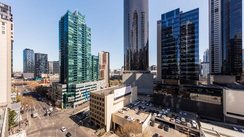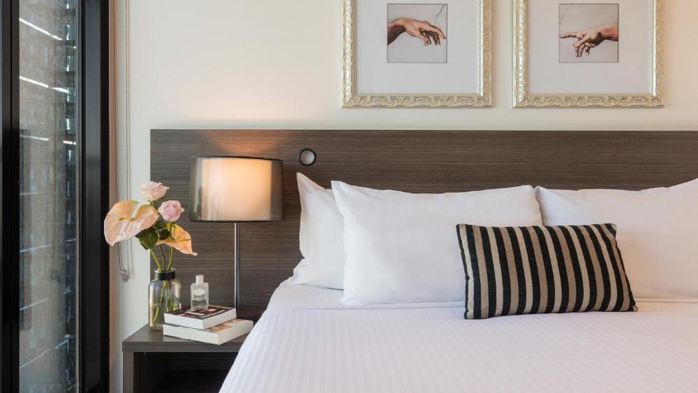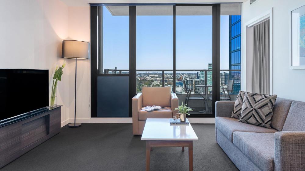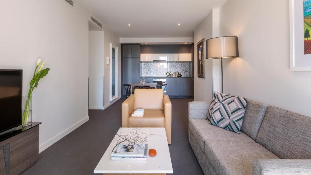 Images highlight bright apartments with open-plan living areas, full kitchens, and spacious bedrooms. Dining tables and lounge areas are styled with clean lines and modern touches. The gallery also captures the heated indoor pool, fitness centre, and on-site restaurant, alongside exterior views showcasing Southbank’s lively riverfront.